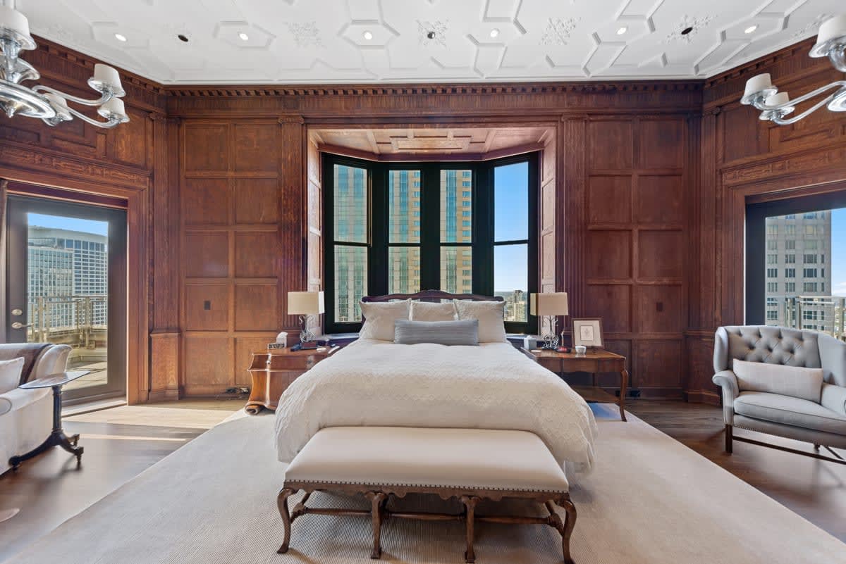 This iconic Chicago duplex penthouse in The Palmolive covers approximately 7,880 interior square feet spread over two floors and a combined 660 square feet of three exterior terraces. Forever views abound from every direction. The second floor boasts 14-foot ceilings, authentic dental molding, and wood paneling in the original office which is now the master bedroom and exquisite master bathroom. Ample closet space, an office, a game room, and much more reside on this level. The enormous chef’s kitchen, living room, dining room, and a bedroom with ensuite bathroom reside on the first floor. Among the standout amenities: a beautiful temperature-controlled wine room, private elevator, two parking spaces, brand-new infrastructure for the entire unit, new hardwood floors, new finishes, and the list goes on.