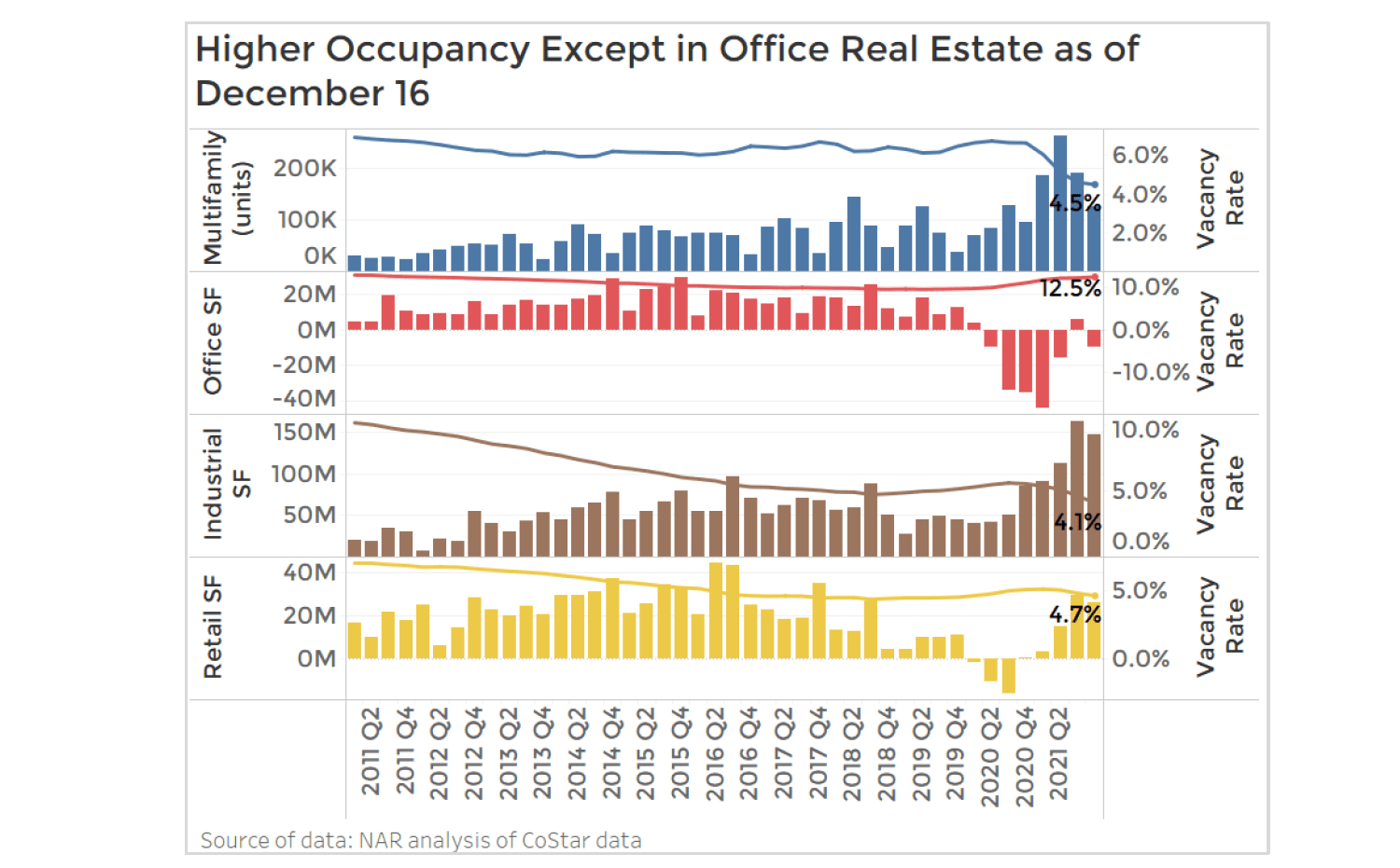 In the three months ended December 18, occupancy rose in the multifamily, industrial, and retail sectors, but fell in the office sector as rising cases of the delta and omicron variant during the summer delayed the return to the office of many companies.