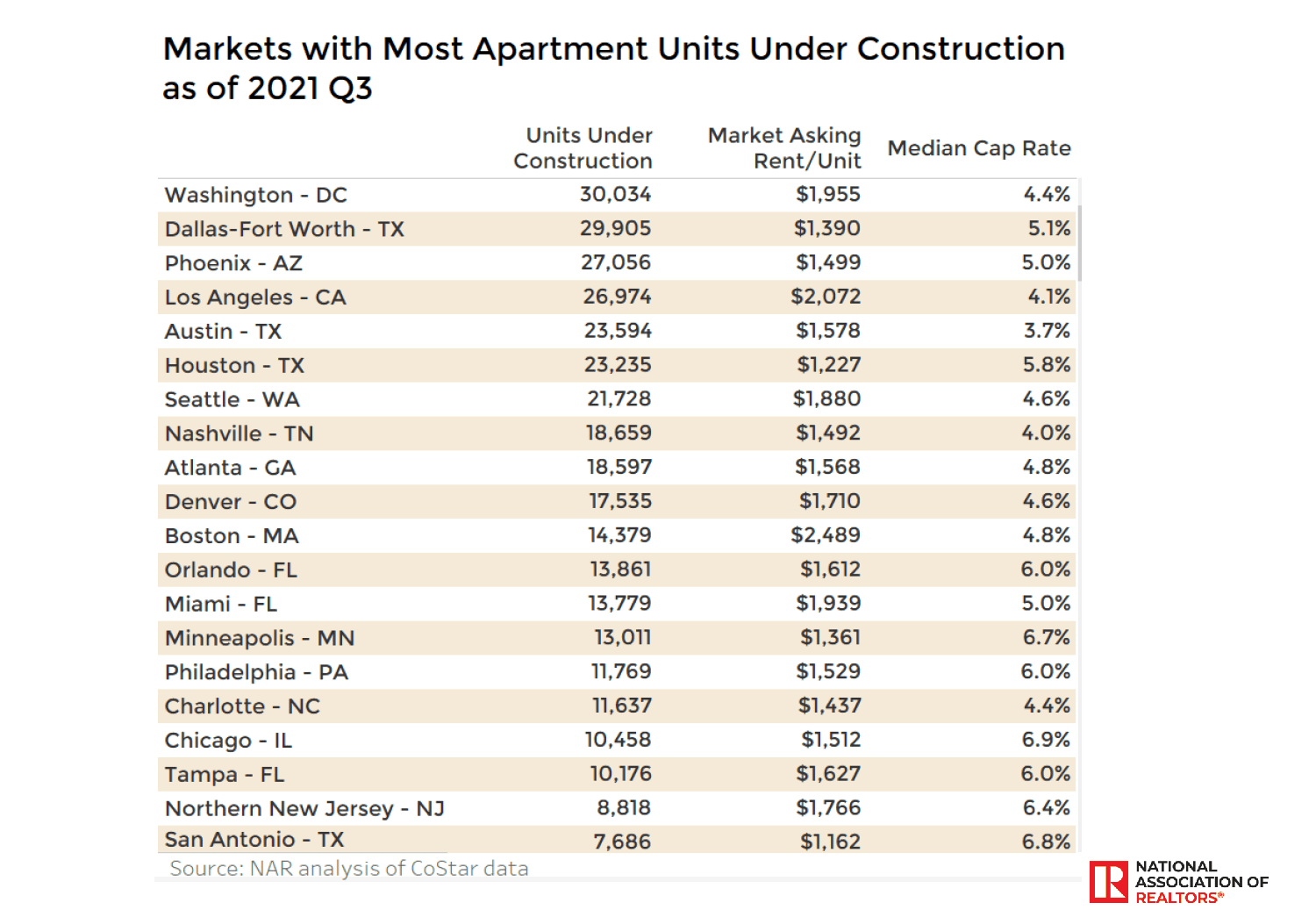 Occupancy is rising across primary and secondary/tertiary markets, with the largest increase in occupancy in Dallas-Fort Worth, New York, Houston, Los Angeles, Washington, DC, Chicago, and Austin each a net absorption of over 25,000 apartment units in the past 12 months as of December 18, 2021. Most metro areas experiencing the highest net absorption are in the Sunbelt states.