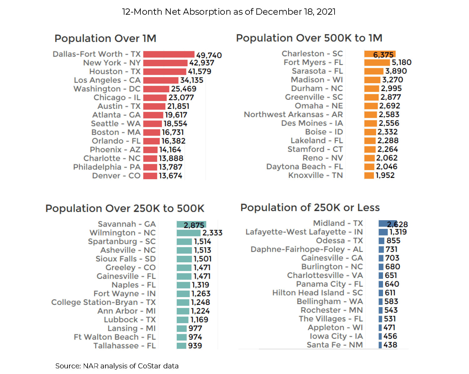 The multifamily market had a historic year, with 1.07 million units absorbed since the pandemic. The vacancy rate hit a record-low of 4.5% as of December 18 while the median asking rent growth hit a record high of 11% year-over-year. Rental demand soared amid the recovery in household formation and with home prices rising at a double-digit pace. Rental demand has increased across primary and secondary markets, with renters returning to the major metro areas of New York, Washington DC, Boston, Chicago, San Francisco, and Los Angeles. However, metro areas in the Sunbelt markets had the largest increase in net demand, led by Dallas, Houston, Charleston, Wilmington, Savannah, and several Florida metro areas.