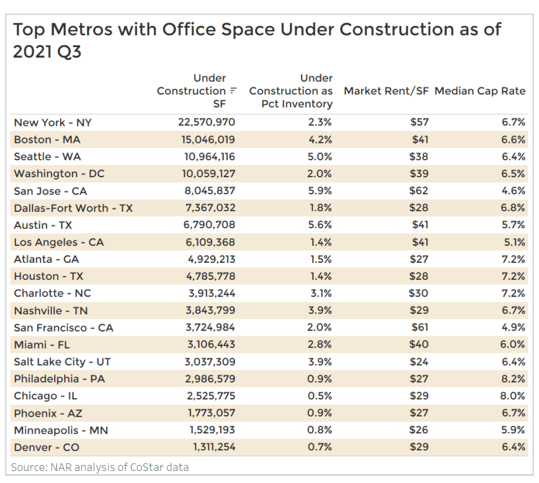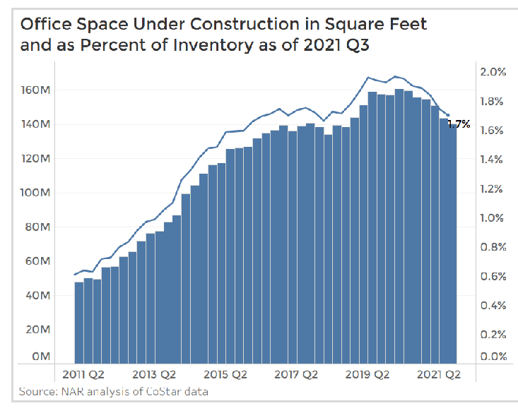 As of 2021 Q3, 140 million square feet is under construction, equivalent to 1.7% of the current inventory of office space. With 145 million of office space given back to the market since the pandemic, the construction underway will add to the current vacant space and will keep a lid on rent growth.