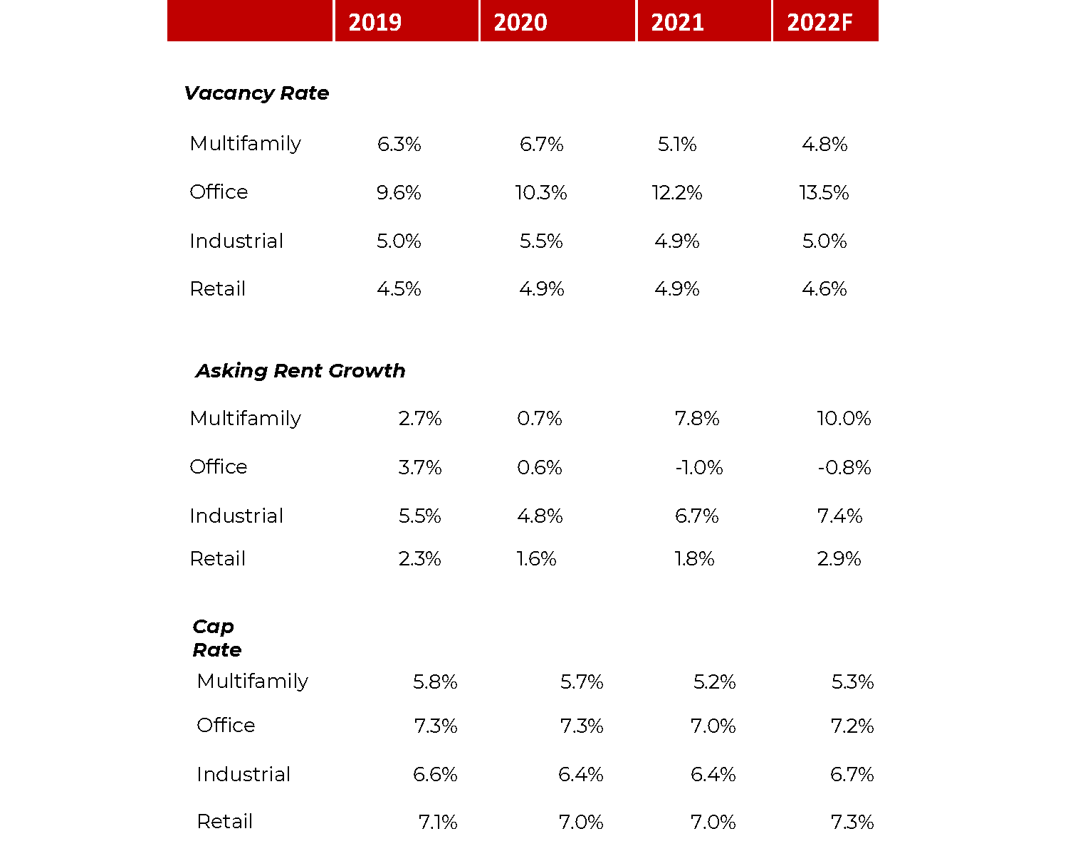 In 2022, sustained household formation, strong consumer spending amid slower inflation and sustained wage growth, continuing re-entry to the office even if mostly on a hybrid schedule, and the expansion of construction and investments in secondary/tertiary markets will drive leasing, construction, and sales. Interest rates are on a course to increase with the Federal Reserve winding down its $120 billion monthly asset purchases and eyeing three federal funds rate hikes. However, interest rates will still be low compared to the pre-pandemic level and even if the T-note hits 2.5% by end of 2022, this will still be lower than the average rate of nearly 3% in 2018. Strong economic property market fundamentals will drive the growth in net operating income, especially in the multifamily and industrial market, and will continue to attract equity capital and sustain price appreciation.