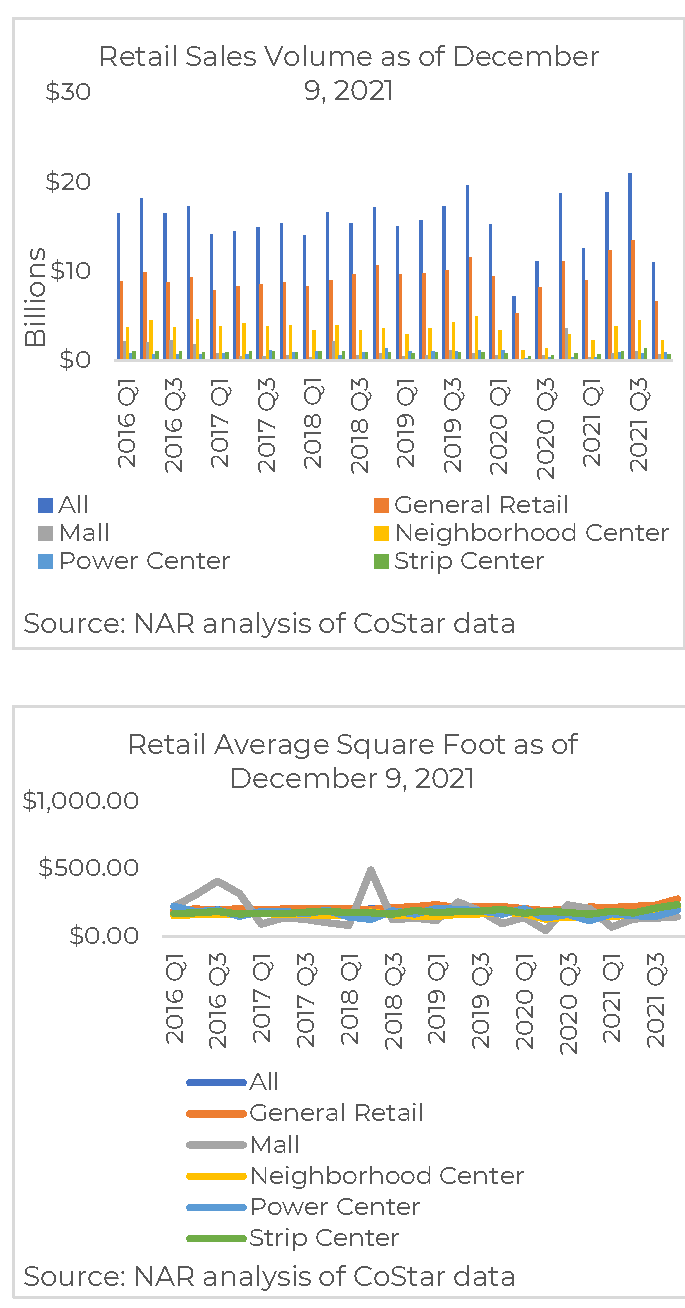 As of December 9, 2021, total sales volume of retail assets totaled $13.7 billion thus far in Q4 2021 and totaled $66.2 billion year-to-date (ytd), with sales totaling $8.1 billion for general retail, mall ($794 million), neighborhood centers ($2.9 billion), power centers ($1 billion) and strip centers ($782 million) in Q4 according to CoStar® data.