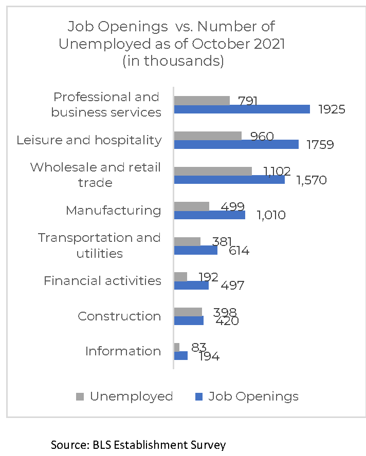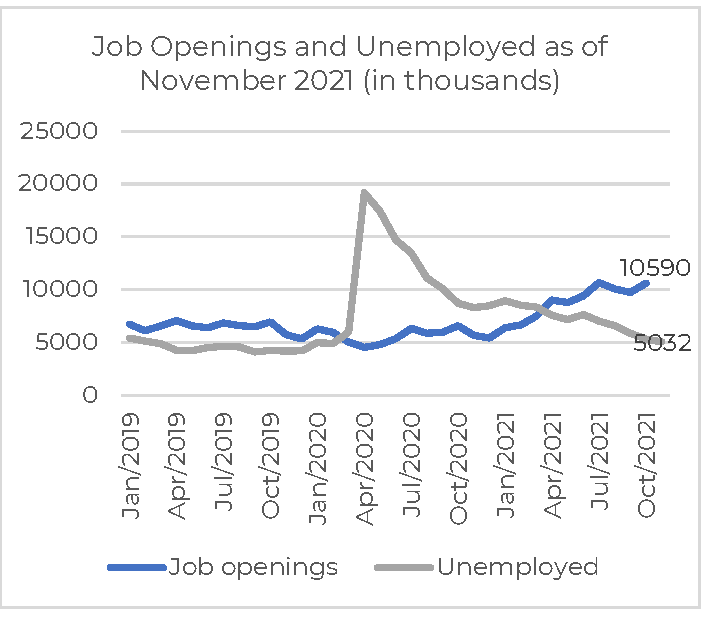 Yet even with 4 million jobs still to be recovered, labor is scarcer relative to the number of job openings. As of the end of October, there were 10.6 million job openings compared to just 5 million workers looking for jobs as of November, or 2 jobs openings per job seeker.