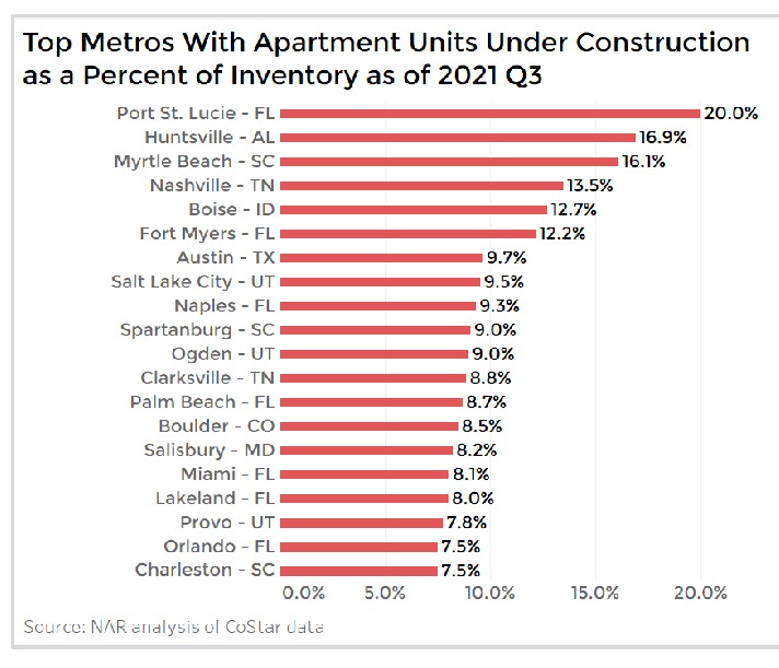 Among metro areas with a population of at least 250,000 Washington DC has the most units under construction, at about 30,000 units, followed by Dallas-Forth Worth, Phoenix, Los Angeles, Austin, Houston, and Seattle, each with at least 20,000 units under construction. However, as a percent of the existing stock, construction activity was most intense in the Sunbelt and Mountain areas led by Port St. Lucie (20% of stock), Huntsville (16.9%), Myrtle Beach (16%), Nashville (14%), Boise (13%), and Fort Myers (12%).
