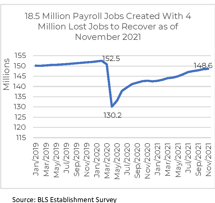 The economy continues to create net new jobs. As of November 2021, the economy has created 18.5 million net new jobs, or 83% of the 22.4 million jobs lost during March and April 2020. There are nearly 4 million nonfarm payroll jobs still to be recovered.