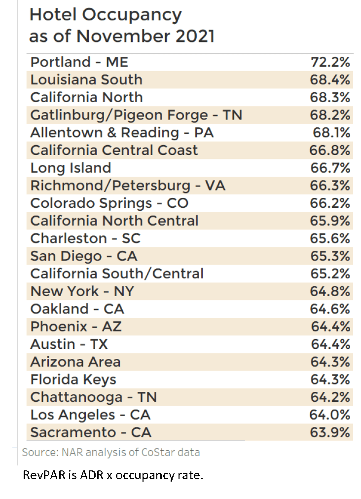 The highest occupancy rates are in Portland (Maine), Southern Louisiana, California North, Gatlinburg, and Allentown/Reading.