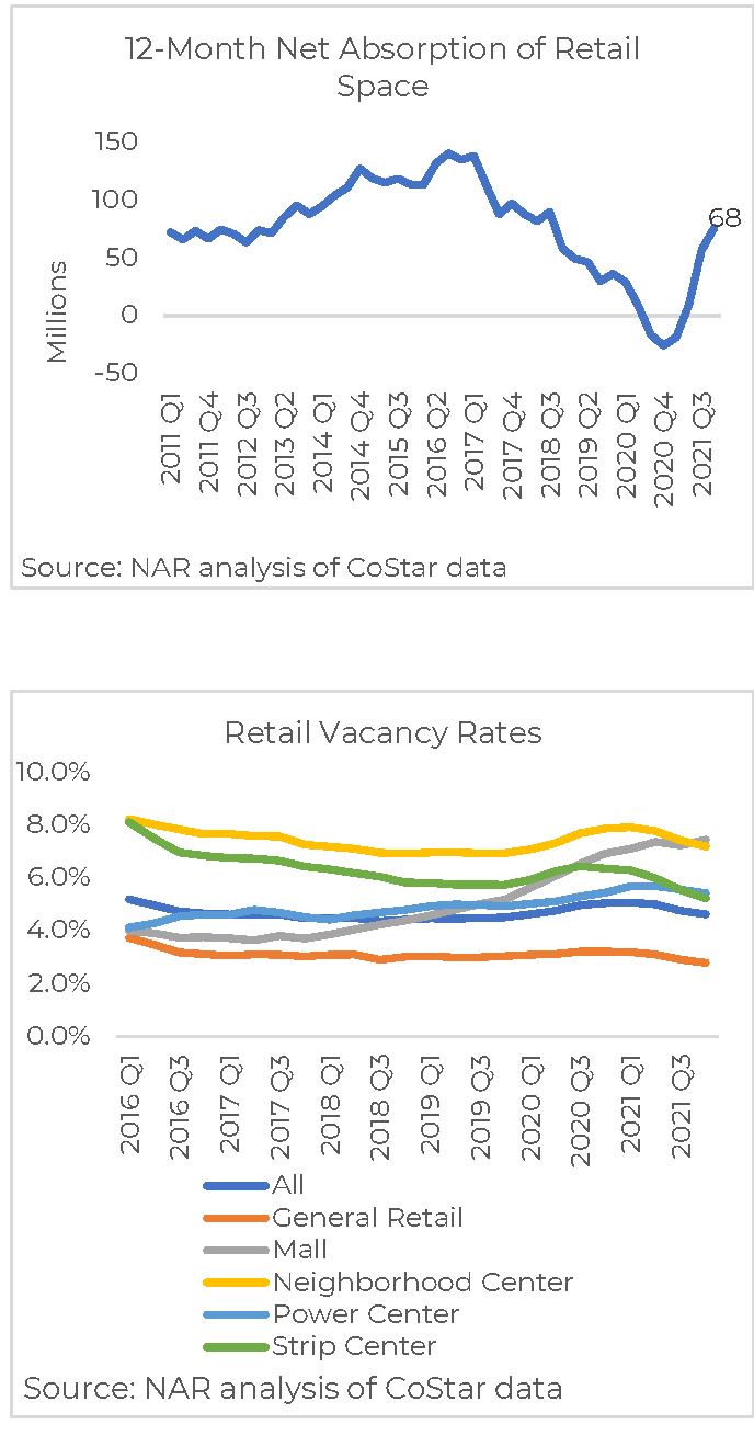 Net absorption of retail space in the past 12 months as of December 9, 2021 was 68 msf. Q4’s most recent data is up from the 50 msf recorded in the prior quarter.