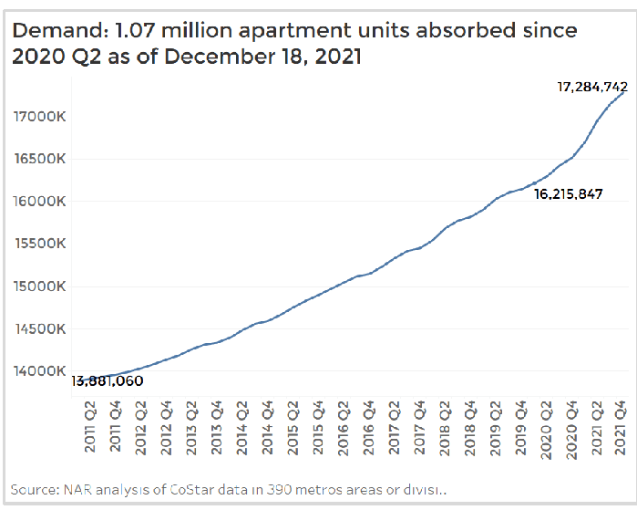 Net absorption of apartment units reached its strongest level in a decade, with a net absorption of 1.07 million units since 2020 Q2. Absorption in the past 12 months totaled 764,788 units.