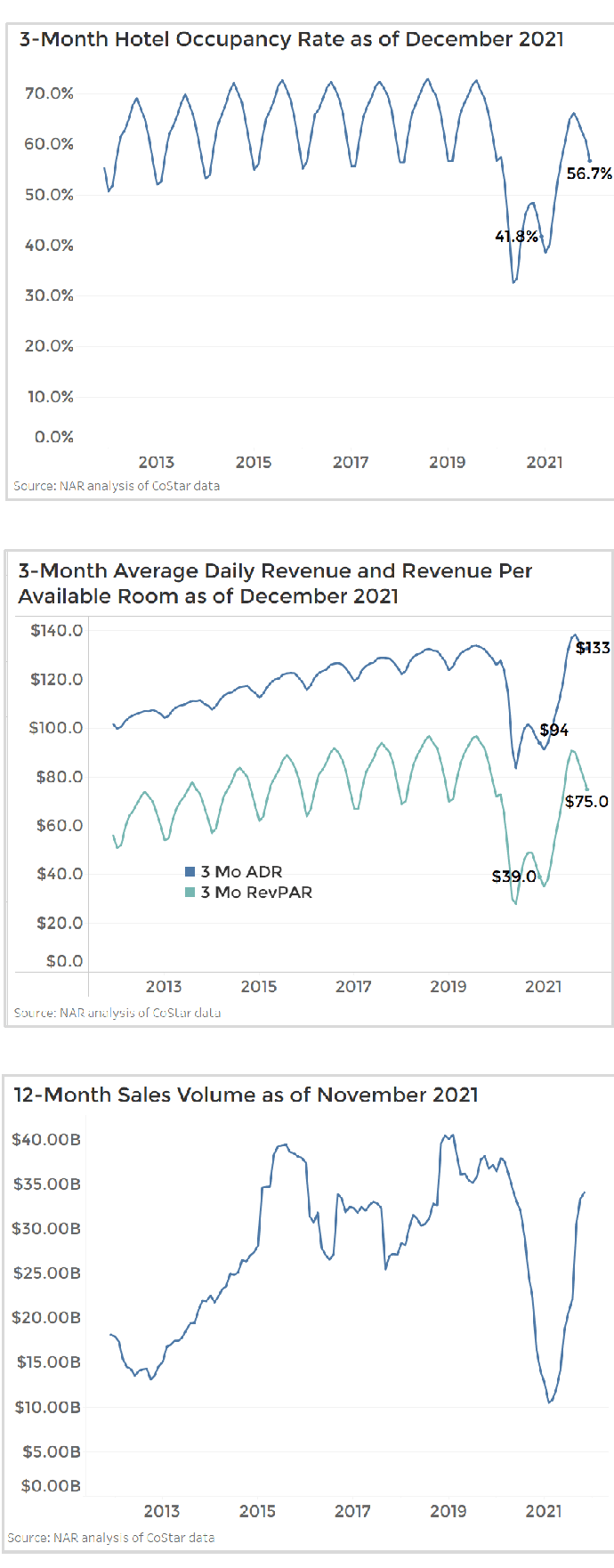 With the progress on vaccination and the uptick in business and personal travel, hotel occupancy improved to 56.7% during the 3-month period as of December 18, 2021 compared to the 3-month occupancy rate of 42% one year ago. The hotel industry’s revenue metrics―average daily rate (ADR) and revenue per available room (RevPAR) ― also improved in the past three months ended December 18 compared to one year ago. RevPAR rose to $75, or double the $39/room rate one year ago while the ADR rose to $133 from $94 one year ago. Sales over a 12-month period have also picked up, increasing to $34 billion as of December, from a low of $10 billion in February 2021. Cap rates have also decreased to 8.6% from 8.8% in February 2020, an indication that hotel property values are firming up.