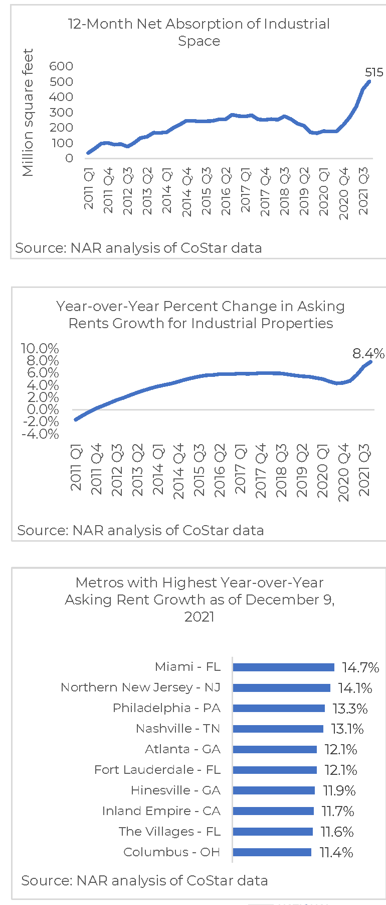 Robust demand for industrial space coupled with decreasing vacancy rates continue to push asking rents up as supply remains limited in comparison to demand. Record net absorption was achieved in Q3 at 166 million square feet (msf) and as of Q4 2021 net absorption totals 143 million as demand remains elevated.