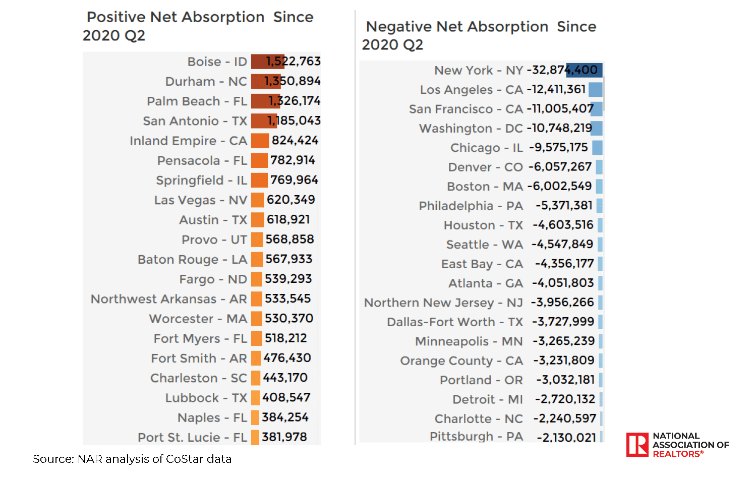 The retail brick-and-mortars managed to survive broadly unscathed, except malls. Since 2020 Q2, 47.9 million square feet of space was absorbed, compared to just 29 million square feet of retail space absorbed in the 12 months before the pandemic hit. Malls saw a decline in occupancy, but that was offset by the positive net absorption from neighborhood centers, strip centers, and free-standing/single-tenant stores.