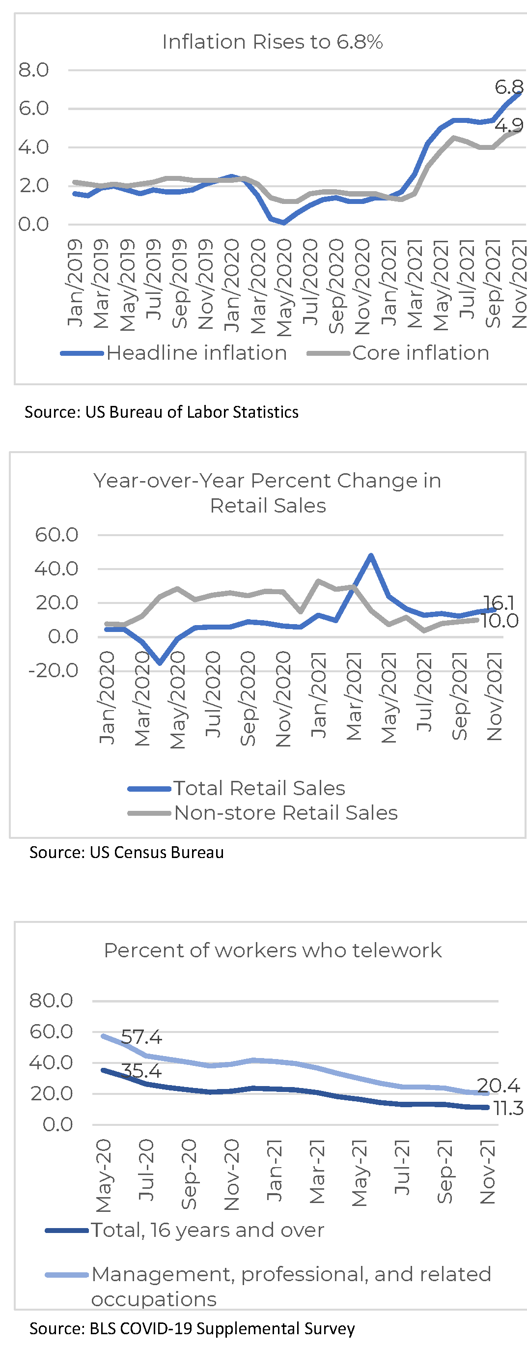 Inflation accelerated to 6.8% in November as core inflation (inflation excluding food and energy) also accelerated to 4.9%, indicating inflation is becoming persistent. In its December 15 meeting, the Federal Open Market Committee decided to wind down its $120 billion per month asset purchases by mid-March, with three potential rate hikes that will increase the federal funds rate to 0.9% by the end of 2022 (from the current 0% low-end rate) to keep inflation anchored at 2%.