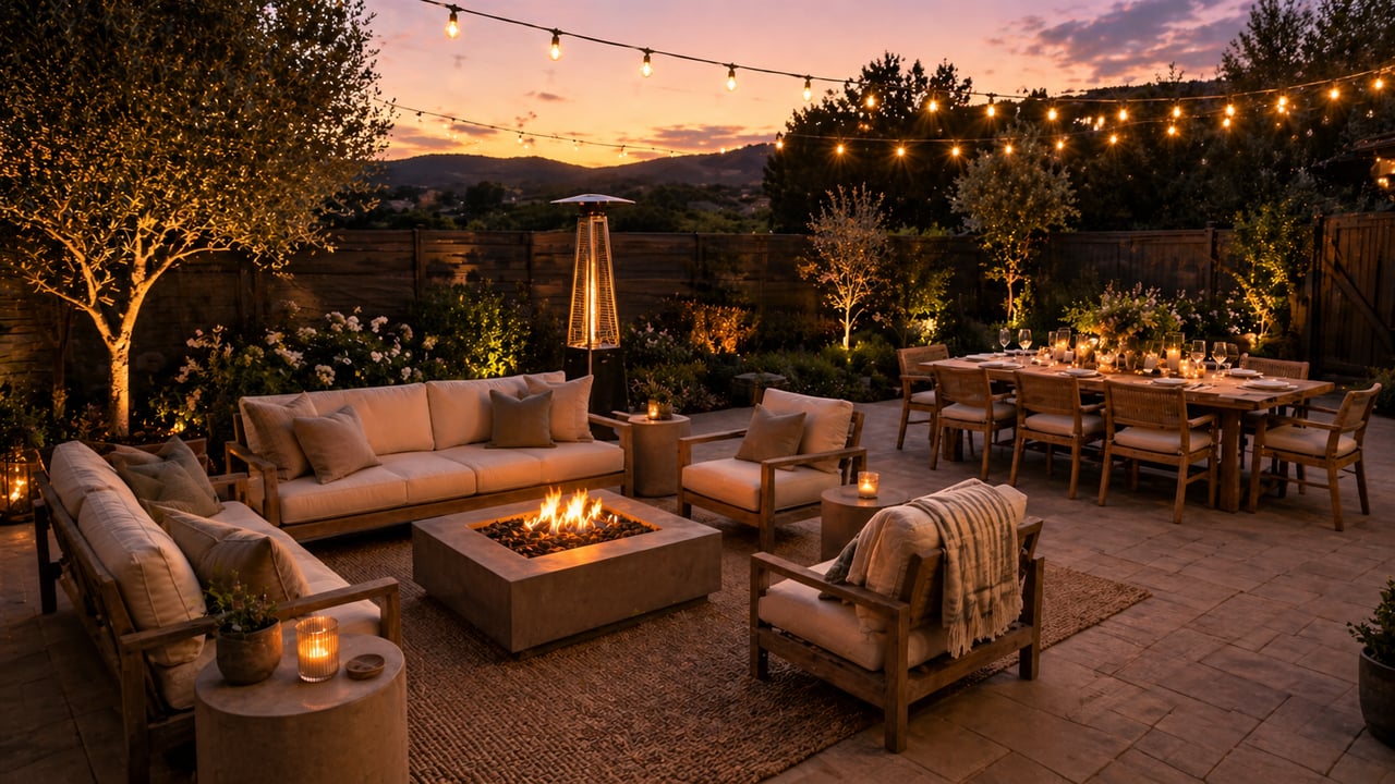 New cushion covers in outdoor linen-look fabric. A large outdoor rug to define the seating zone. One or two potted olive trees flanking the entrance or dining area. A freestanding patio heater or fire pit for cool evenings. String lights on a timer set for dusk. A large outdoor lantern for the dining table. That is a complete visual and functional refresh with no construction required.