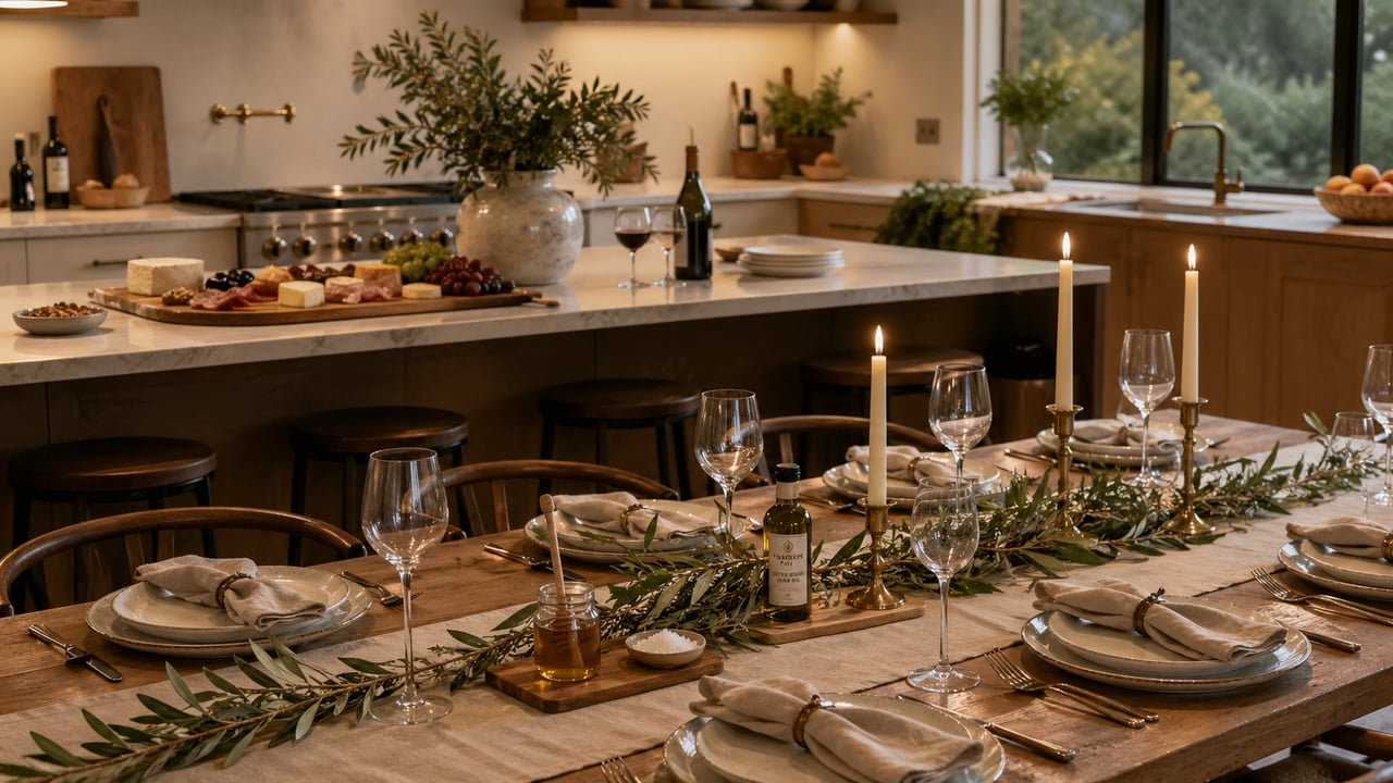 The dining table should be set before anyone walks in the door. Not formally but intentionally. Linen napkins rather than paper. Simple matte ceramic plates in a tone that works with the table material. A low centerpiece of olive branches, ranunculus, or fresh herbs from the garden. Three or four candles at varying heights down the center. Good stemware already set out at each place. When guests walk in and see a table that is already expecting them, the evening has already started well.