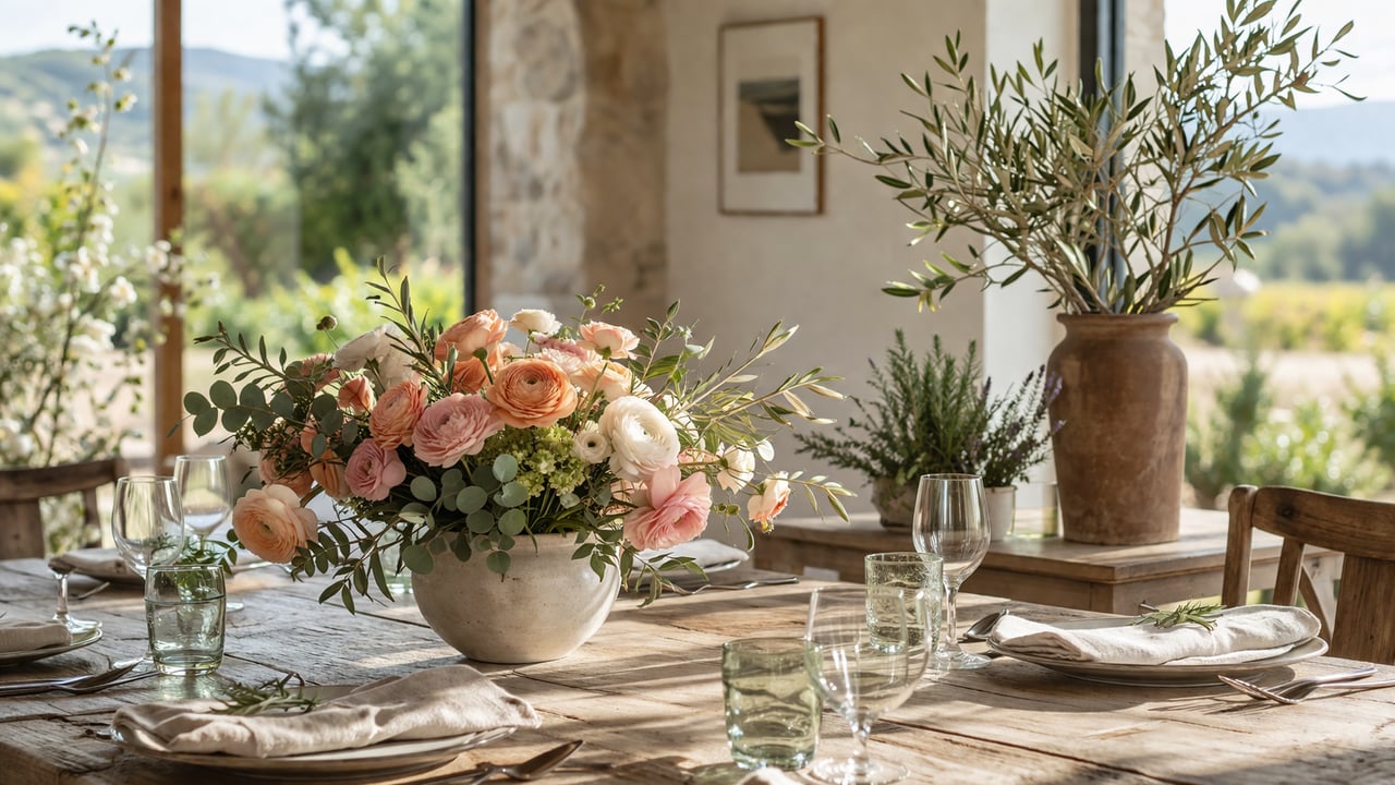 Keep arrangements low enough that people can see across the table. A dense cluster of ranunculus in a simple ceramic vase. A few long olive branches in a tall earthenware vessel in the entry. A small sprig of rosemary or a single stem laid across each napkin at the table. Fresh herbs bundled loosely in a glass of water on the kitchen counter. These are gestures rather than statements, and they land more powerfully than an elaborate arrangement that announces itself from across the room.