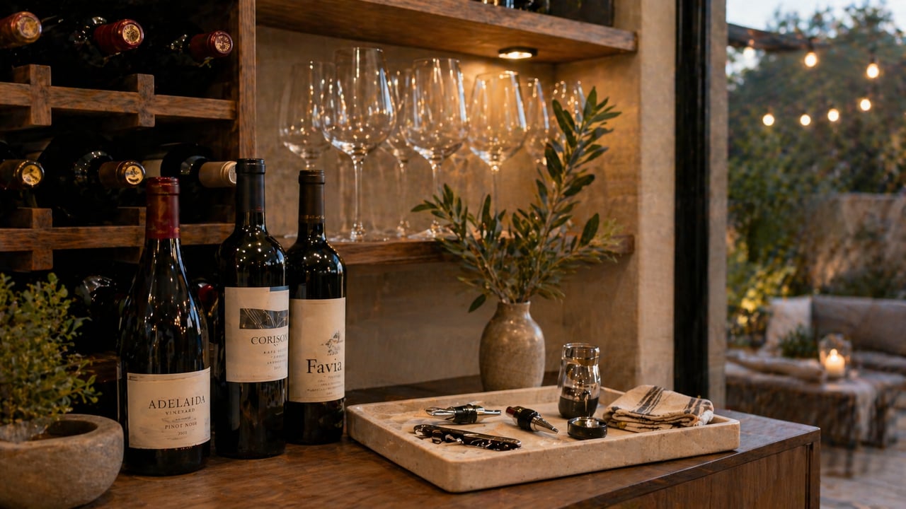 The most effective wine areas are organized by story rather than by price. Group wines by producer, by region, or by occasion. A section for the everyday bottles you open on a Tuesday night. A shelf for special occasion wines from producers you love. A small rotating selection of what you picked up recently on tasting visits around the valley. This gives guests something to explore and gives every bottle a context beyond its label.